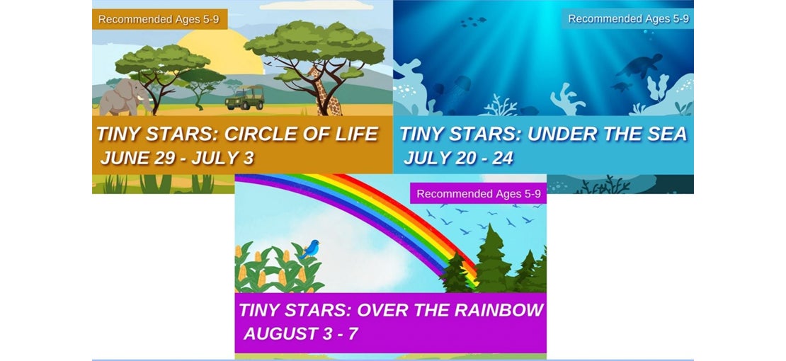 Join us for either a morning or afternoon session of Tiny Stars camp- or stay the whole day! Both morning and afternoon groups will learn different songs and dances, and those that participate in both will get a lunch break from 11:45-12:15pm everyday. Both groups will participate in a joint showcase on Friday evening.