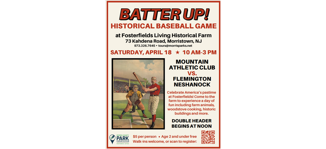 Celebrate America’s pastime at Fosterfields! Come to the farm to experience a day of historic baseball. At noon, the Flemington Neshanocks take on the Mountain Athletic Club in two back-to-back games. Games begin at 12 noon and run until 3:30.