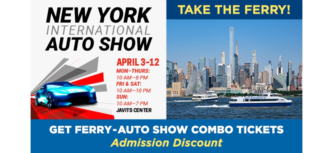 NY Waterway Ferry is the fastest and easiest way to get to the New York International Auto Show from NJ, and we now made it even easier with a NY Waterway/Auto Show Combo Ticket. The combo ticket includes a round-trip ferry ride from Port Imperial Weehawken to Midtown/W.39th St. and Auto Show admission.