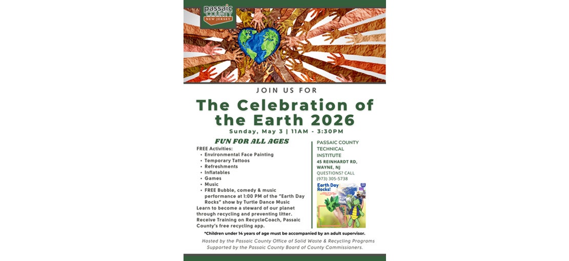 Join the Passaic County Office of Solid Waste & Recycling Programs on Sunday, May 3, 2026 for our annual Celebration of the Earth (2026), happening from 11:00 AM to 3:30 PM at the Gymnasium at Passaic County Technical High School (PCTI), 45 Reinhardt Road, Wayne, NJ!